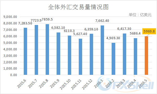 台湾中央银行今日下午公布了5月份的外汇市场概况。2016年5月指定银行及国际金融业务分行之外汇交易,经剔除银行间交易重复计算部分后,全体外汇交易量净额5969.8亿美元,环比增加5%,日均外汇交易量为284.3亿美元,比4月的299.3亿美元减少15亿美元。