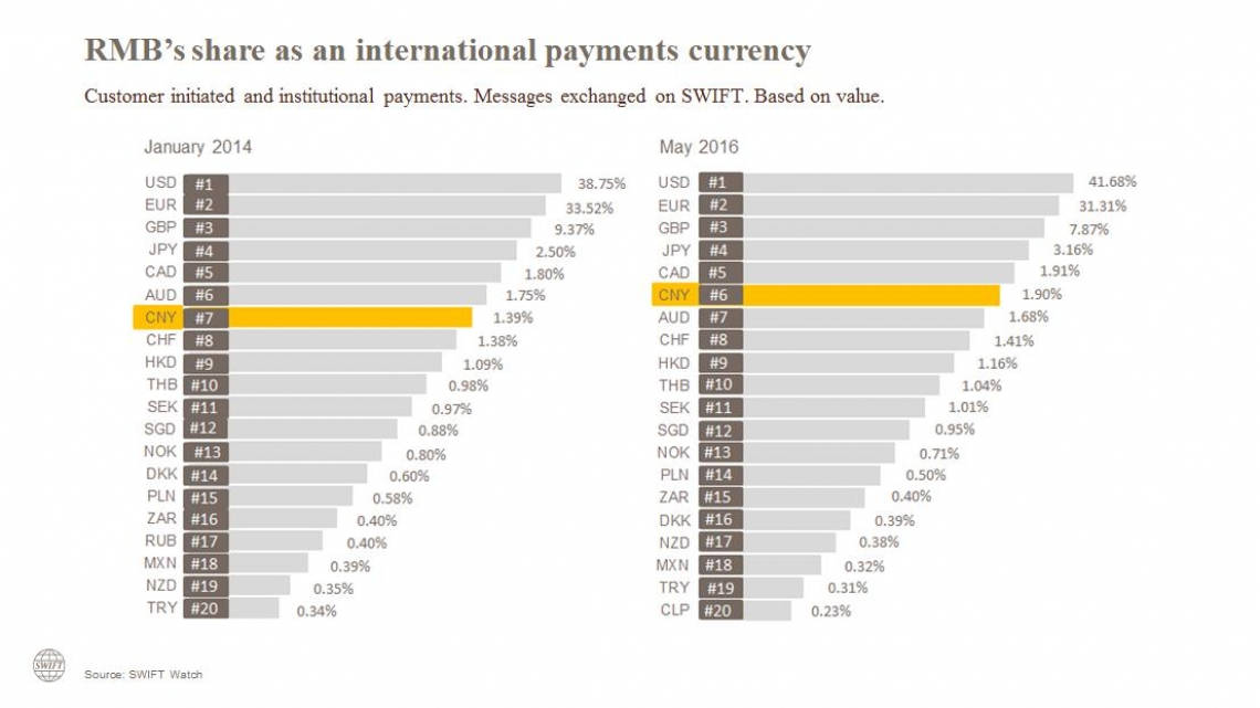全球知名金融信息服务提供商环球银行金融电信协会(SWIFT)日前发布了针对人民币的月度追踪数据报告。根据5月最新数据,人民币在全球支付排名中位列第六,占全球支付金额比重的1.9%。而目前排名前五的依然是美元、欧元、英镑、日元、加元。