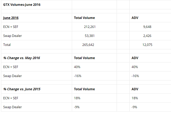 今日,著名零售外汇经纪商嘉盛旗下的机构外汇交易平台GTX发布了6月份的外汇交易数据,6月外汇交易量2123亿美元,比5月份的1515亿美元增加24%。其中电子网络交易(ECN)和掉期执行交易(SEF)部分日均交易量(ADV)达到96亿美元,环比猛增40%。互换交易部分环比减少16%。(下图单位:百万美元)