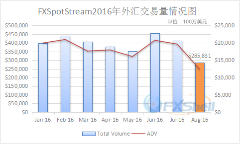 FXSpotStream8月的外汇总交易量2858亿美元,日均交易量(ADV)124亿美元,比7月份的196亿美元猛减36.8%,同比减少20.6%。■