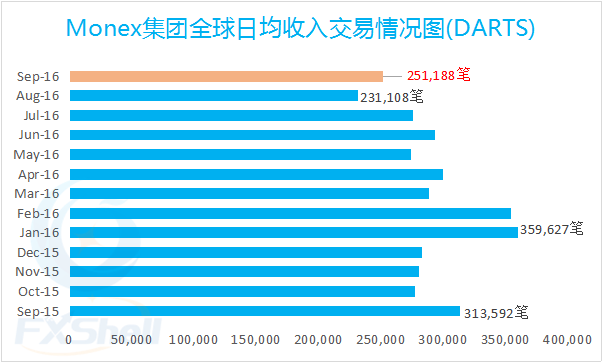 日本外汇经纪商Monex集团(Monex Group)今日公布了2016年9月份的运营报告。Monex集团9月全球日均收入交易(DARTS)251,188笔,环比增加8.7%↑,同比减少19.9%↓。