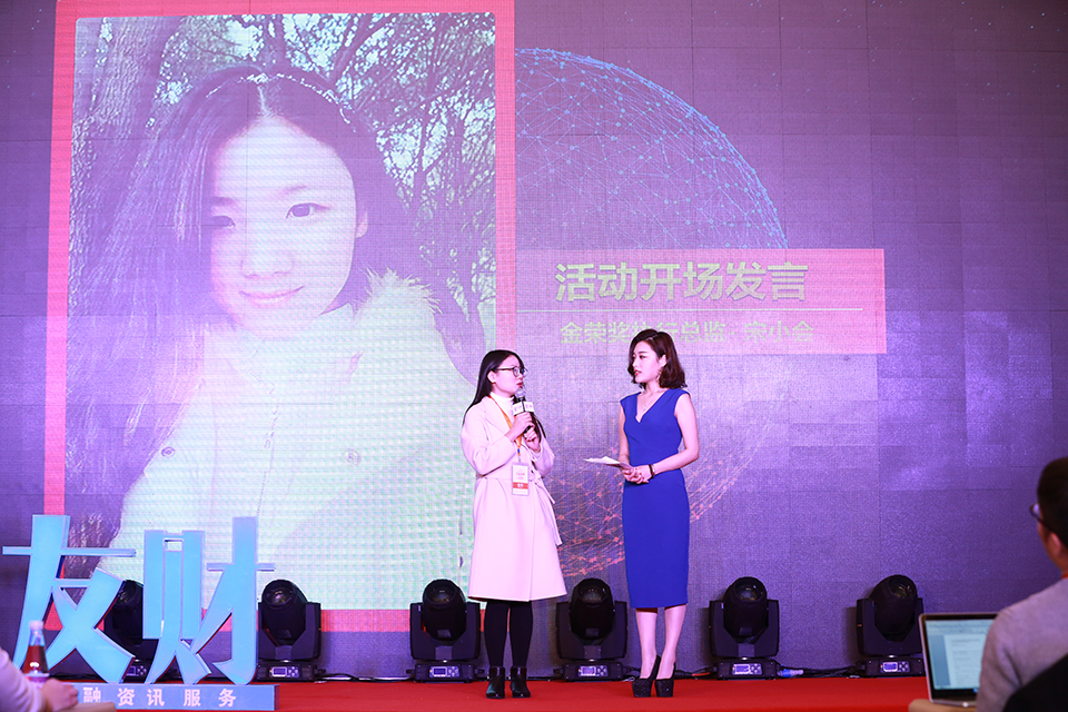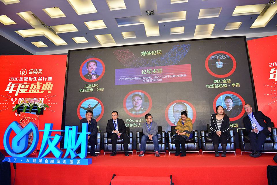 金荣奖执行总监-宋小会、汇通财经董事/副总经理-万欣、友财网市场总监-susu、清华总裁班培训导师-陈敬全、友财网技术总监-李元、悦华黄金外汇交易学院创始人-邵悦华为以上获奖代表颁奖。