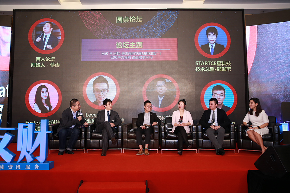 百人论坛创始人蒋涛、Fortex方达科技机构顾问副总监谢萍、STARTCE星科技技术总监邱珈苇、Leverate利瑞高级业务经理吴永隆、博亘金融科技集团市场总监李雯倩、DooHolding总经理陈俊杰就在圆桌论坛上与我们就《Mt5 与 MT4 未来趋向发展战略和推广?以客户为导向谁更需要MT5》进行了深度的讨论。