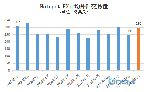 Hotspot FX 2017年1月外汇交易总量达到6501.1亿美元,共22个交易日,日均交易295.5亿美元。