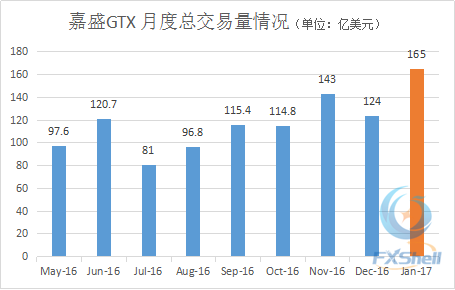 嘉盛集团旗下机构外汇交易平台GTX交易量近半年节节攀升,与零售外汇业务的缓慢衰减趋势截然不同。2017年首月,GTX平台下联合ECN(电子网络交易),掉期交易和互换交易的总交易量高达3628亿美元,环比猛增33%,超越美国大选月的高纪录,再次抵达巅峰。