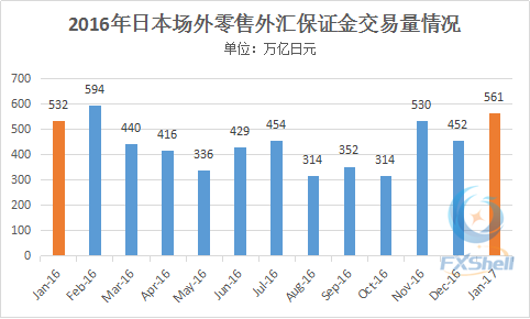 据日本金融期货协会(FFAJ)统计发布的53家会员交易数据,2017年1月,日本场外零售外汇交易量录得近11个月以来最佳成绩,一扫去年阴霾。