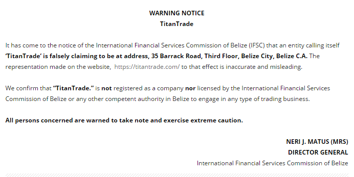 伯利兹国际金融服务委员会(IFSC)昨日晚间(2月20日)在官网发布警告称,二元期权经纪公司TitanTrade未经授权谎称位于伯利兹(具体地址为35 Barrack Road, Belize City, Belize),并在当地从事金融服务。