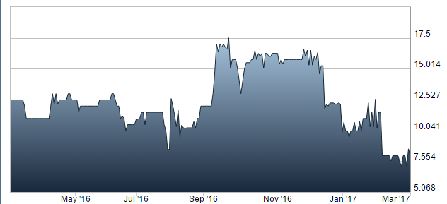 截至发稿,TechFinancials每股报9.25便士,较日前上涨23.3%。下图为近一年的股价变化,2016年来TechFinancials市值已缩水近5成。■