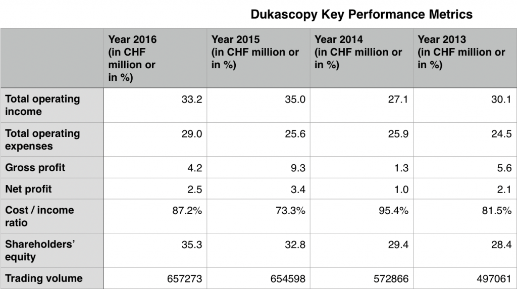日前,瑞士知名外汇银行杜卡斯贝(Dukascopy)公布了公司2016年尚未审计的财务报告。这份报告的相关数据显示,去年全年,杜卡斯贝总体交易量小幅上升,营业收入略有减少,投资活动增加,总体利润有所下滑。