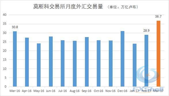 俄罗斯最大的外汇、股票、衍生品交易平台莫斯科交易所(MOEX)日前发布了2017年3月份的运营数据。其外汇部分交易总量为36.7万亿卢布(约合6,425亿美元),实现了今年一季度的第二次增长,达到去年3月以来的最高值。