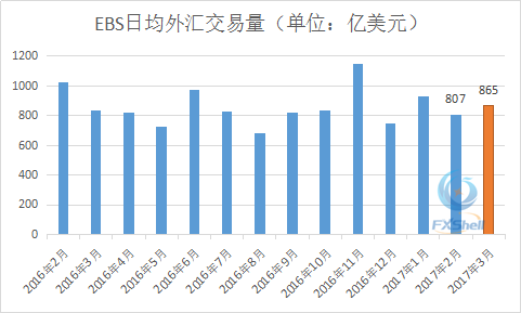 2017年3月,EBS日均外汇交易量为865亿美元,较2月的807亿美元增长7%↑,比去年同期的837亿美元增长3.3%↑。