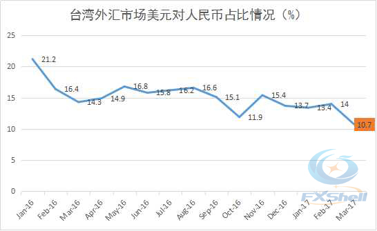 受人民币贬值及法国大选影响,3月份美元对人民币交易及其他外币交易变化较大,美元对人民币交易占比仅10.7%,减少3.3%↓,达到两年来的最低值;