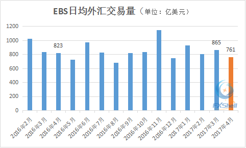 2017年4月,EBS日均外汇交易量为761亿美元,较3月的865亿美元下降12%↓,比去年同期的823亿美元减少7%↓,这也是自去年8月以来,EBS交易量最低的月份。
