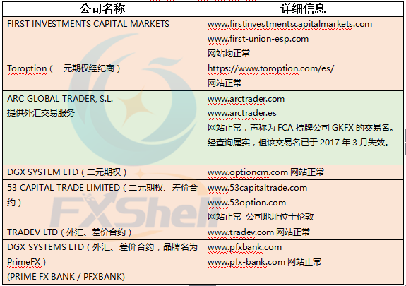 今日,7家外汇及二元期权公司被西班牙证券市场委员会CNMV(Comision Nacional del Mercado de Valores)列入最新警告名单。他们分别是PrimeFX/ PFXBANK 、53option、ARCTRADER、Toroption、firstinvestment等,具体信息如下: