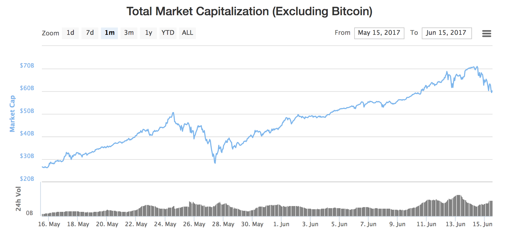 仅仅几个小时之后,交易员就报告了战略的转变,全球的数字加密货币市场似乎正在快速变化。截至发稿时间,按市值计算的十大数字加密货币全部处于下跌行情,其中八个跌幅超过10%。即使是比特币,被认为是数字加密货币中的的“ 避风港 ”也并无例外,其价格降到自5月31日以来最低水平。截至发稿时间,比特币价格已比其最高位时下降了16%。