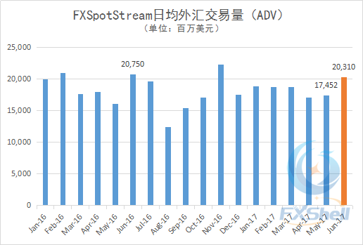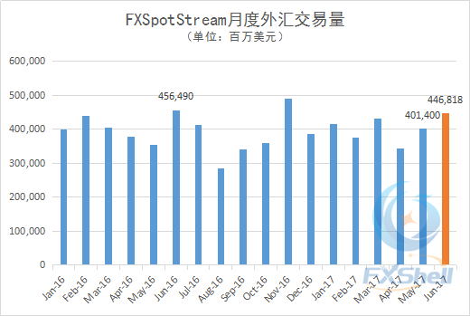 • 2017年6月,提供多银行外汇集合报价服务的FXSpotStream总交易量为4,468亿美元,环比增长11.3%↑,同比减少2.1%↓;