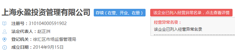 此外,另有一家“上海永盈投资管理咨询有限公司”已于2010年5月30日被吊销营业执照,该公司成立于2007年7月4日。