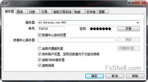 第一步:点击MT4软件中的工具→选项,在弹出的对话框中的服务器栏输入mt.forexua.com:443,如下图所示,然后点击确定;