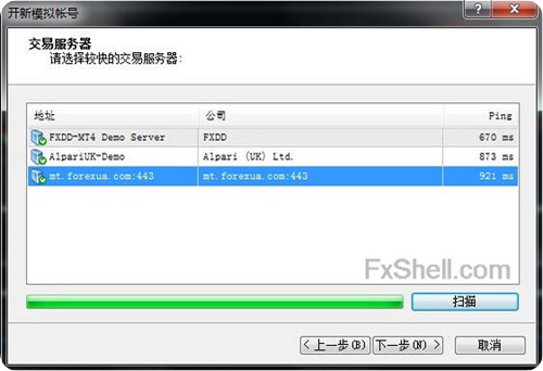第二步:在MT4软件中开设新模拟帐号,填写相关信息后,点击下一步,如下图所示,可查看到新添加的服务器地址一栏,然后点击扫描、下一步,最后就可以看到新注册的带有美元指数的模拟账户。