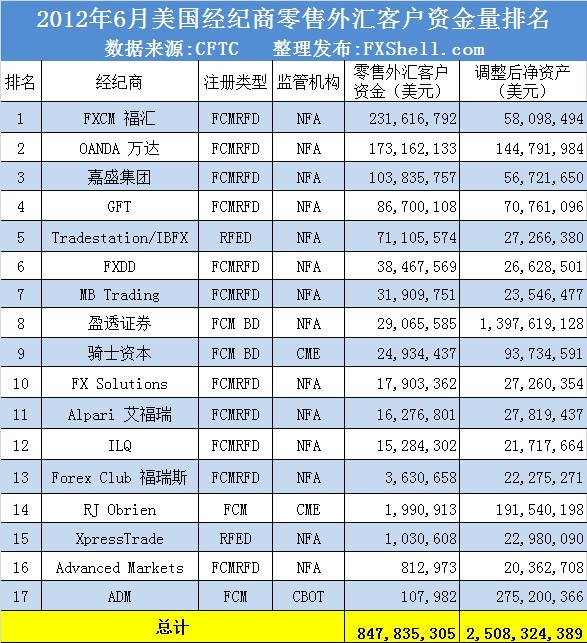 截止2012年6月30日美国零售外汇客户资金排名表: