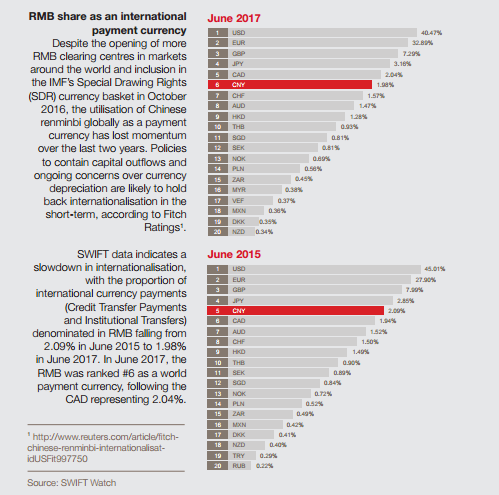 SWIFT人民币追踪器显示,2017年6月人民币在全球支付货币中位列第六,人民币国际支付(客户发起的支付和机构转移)比例从2015年6月的2.09%下降到2017年6月的1.98%。人民币国际化进程在放缓。尽管人民币努力国际化,美元仍然是支付给中国的主要货币。例如,美国向中国发货98%的付款是美元,所有国家的人民币支付份额仍然很低,仅有1%至2%。除了台湾地区15%的付款以人民币计价。