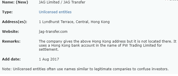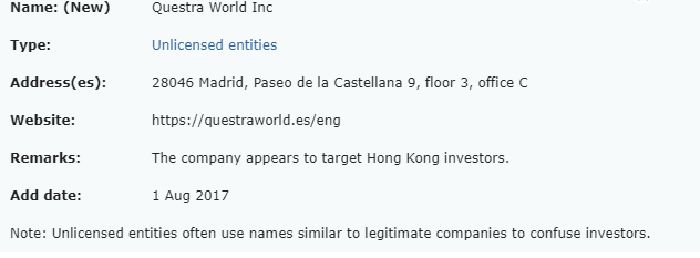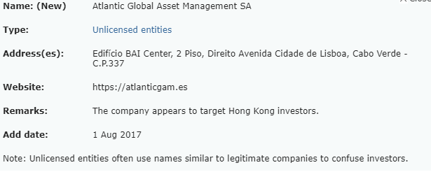 此外,香港SFC还将三家投资公司Atlantic Global Asset Management SA、Questra World Inc以及JAG Limited列入无牌警告名单。具体信息如下: