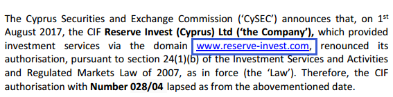 汇讯网(www.fxshell.com)获悉,塞浦路斯投资公司Reserve Invest (Cyprus) Ltd已于8月1日放弃塞浦路斯证监会(CySEC)的CIF授权,其运营网站不再为投资者提供服务。