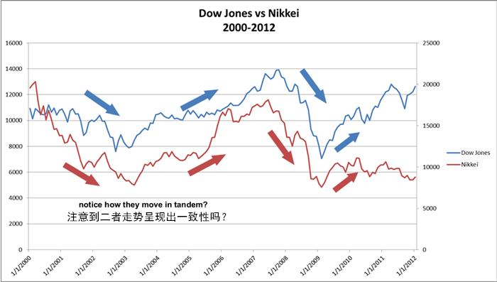我们可以看看道琼斯工业平均指数和日经指数之间的关系,并由此了解世界各股市之间是如何相互关联的。