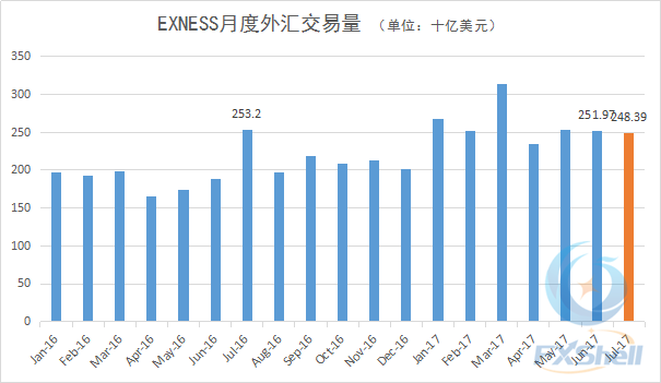 2017年7月,EXNESS的外汇交易量为2,484亿美元,环比减少1%↓,同比减少2%↓;