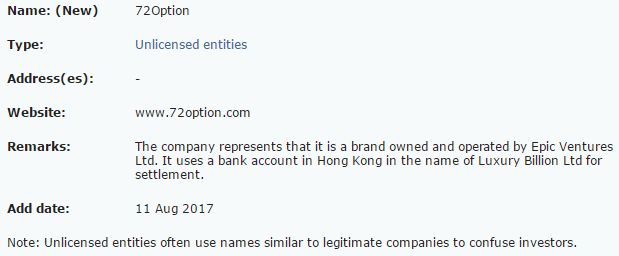 此外,72Option曾于去年12月被加拿大BCSC警告,上月底又被澳洲ASIC列入警告名单。