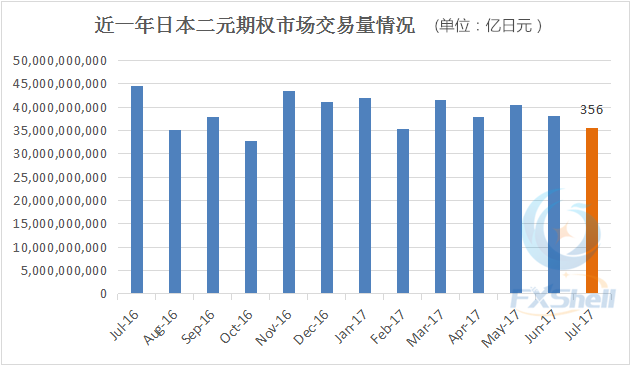 据汇讯网(www.fxshell.com)追踪统计,7月日本二元期权市场总交易量为356亿日元(约合3.23亿美元),环比减少7%,同比减少20%;
