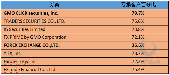 7月向FFAJ递交数据的二元期权经纪商共8家,其中新晋二元期权经纪商Forex Exchange继续保持低位的亏损客户率,而GMO Click证券成为7月亏损客户百分比最高的券商。■