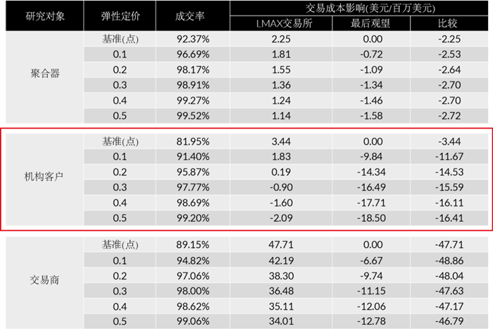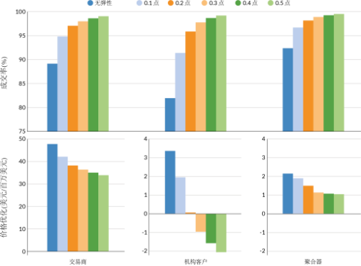 以机构客户为例,基本情况(即无弹性,图中深蓝色部分)下,成交率只有82%,但价格优化却超过3美元/百万美元。