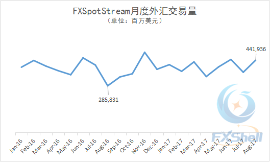 • 2017年8月,FXSpotStream的外汇总交易量为4,419亿美元,环比增长19.9%↑,同比增长54.6%↑;