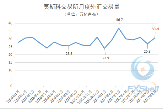 2017年8月MOEX外汇交易总额达到30.4万亿卢布(约合5,254亿美元),环比增长13.4%↑,同比增长19.2%↑;