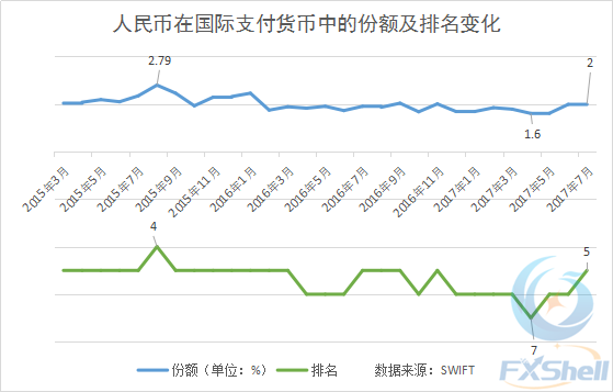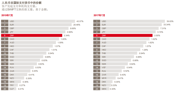 根据SWIFT(环球同业银行金融电讯协会)发布的“人民币追踪(RMB Tracker)”月度数据报告,2017年7月,人民币成为国际支付第五大最活跃货币(按金额),排名前四的依次是美元、欧元、英镑和日元。