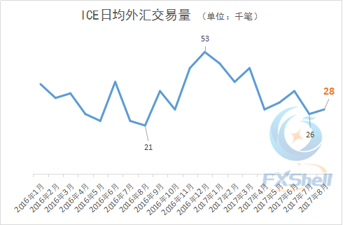 2017年8月,ICE的外汇日均交易量(ADV)为2.8万笔,较7月增加2,000笔,环比增幅为7.7%↑,同比增长33.3%↑,与上半年的平均水平相差约1万笔。