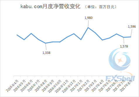 2017年8月,日本五大外汇经纪商之一东京三菱UFJ金融集团的控股公司——kabu.com的净营收达到15.96亿日元(约合1,482万美元),与7月基本持平,同比增长19.3%↑。