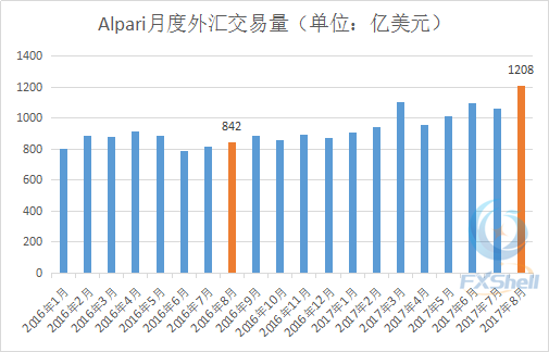 据汇讯网(www.fxshell.com)追踪统计,2017年8月份外汇经纪商Alpari在主要市场上的交易量环比增长14%,达到1208亿美元,这是alpari连续第四个月交易量录得千亿美元以上。