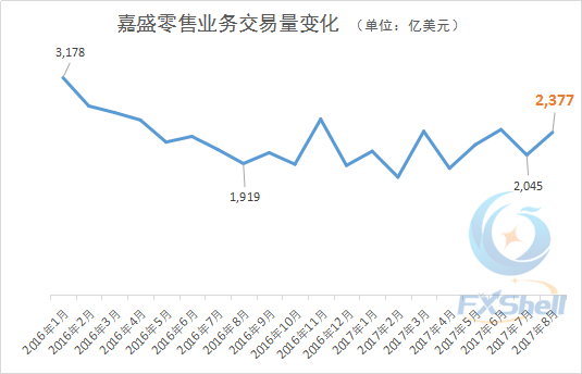 • 2017年8月,嘉盛的零售业务交易量环比增长16.2%↑,达到2,377亿美元,同比增幅达到23.9%↑,高于今年上半年的平均水平;