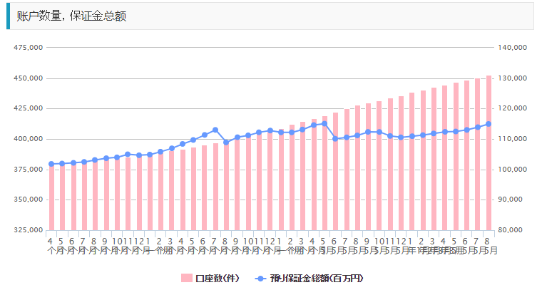 外汇行业数据统计 日本Gaitame 8月外汇交易量微幅上升 作者 Frances - 2017-9-12 14:12:32 2107 据汇讯网(www.fxshell.com)追踪统计,日本零售外汇经纪商Gaitame 8月外汇交易量为1991.02亿日元(约合18.23亿美元),较7月增加5%,较去年同期增长8%。 截至8月,Gaitame客户存入的保证金总额为10.52亿美元,与上月基本持平;总外汇账户量为452,633个,较上月增加2131个。详情如下图:(图一展示账户量及保证金存入量)(图二展示交易量变化) 版权声明 :本站文章未经授权不得转载。对已获授权的媒体、机构、个人,在使用时须注明来源“汇讯网”。