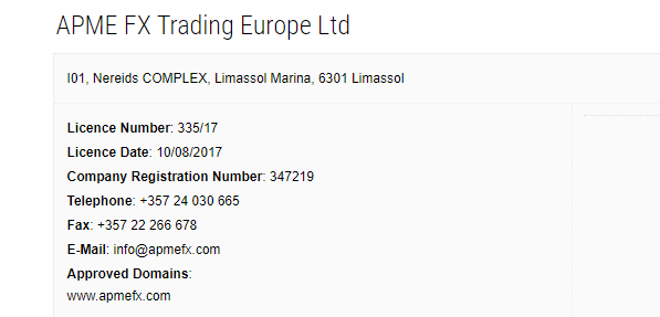 根据授权信息,APME FX Trading Europe Ltd的注册号为:347219,许可证编号为:335/17,牌照已于2017年8月10日正式生效。详情见下图: