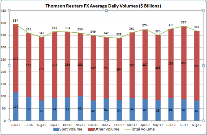 根据汤森路透公布的旗下电子交易平台Matching、FXall和汤森路透SEF的综合外汇交易数据,2017年8月,涵盖即期、远期、掉期、期权和无本金交割远期交易量的外汇交易数据如下: