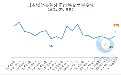 根据日本金融期货协会(FFAJ)今日公布的数据,2017年8月,日本场外零售外汇市场的交易量终结了6月、7月的下滑趋势,与去年同期相比也有增长,较去年平均水平(约为433万亿日元,等值3.9万亿美元)及今年上半年平均水平(约为387万亿日元,等值3.5万亿美元)仍有差距。