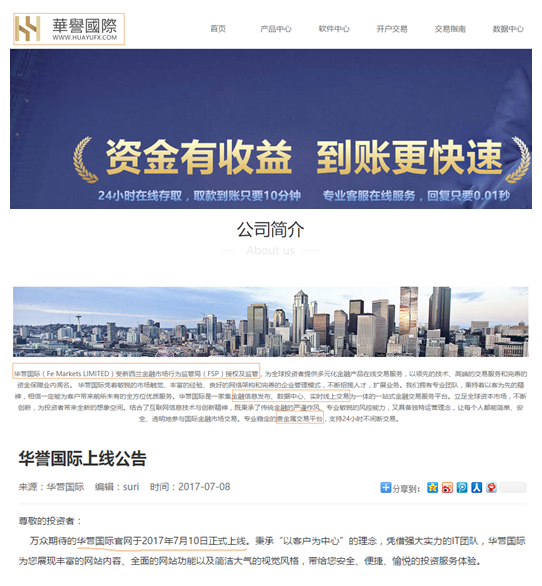 另据汇讯网(www.fxshell.com)查询,华誉国际域名注册于2017年5月16日,官网于7月10日正式上线,而网站并未给出办公地址信息。■