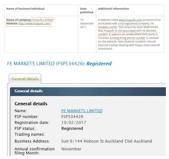 新西兰金融市场监管局(FMA)今日发布投资警告,Huayu International Investment(Huayufx)与新西兰的FSP注册公司FE MARKETS LIMITED无关,前者隶属于一个未知运营者且其网站提供的电话号码来自香港。