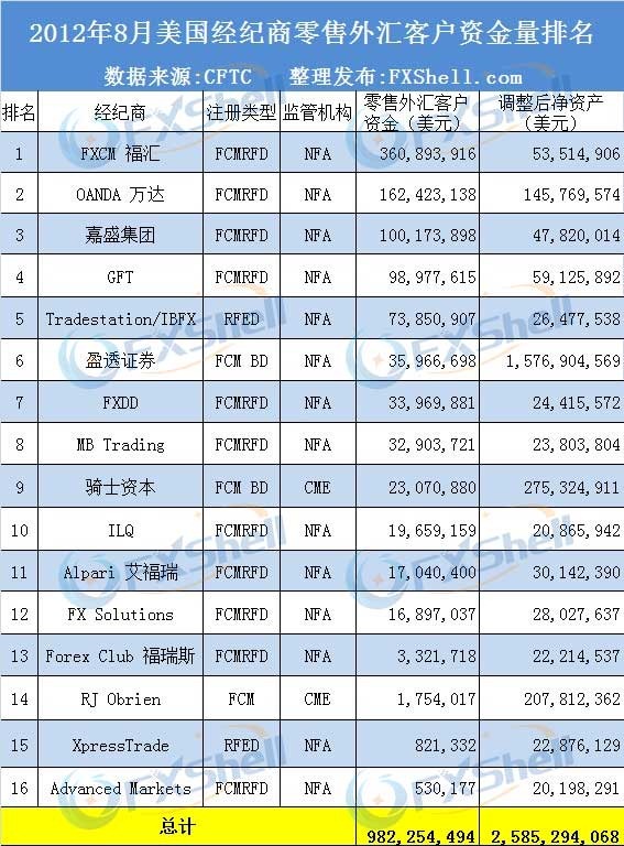 截止2012年8月31日美国零售外汇客户资金排名表: