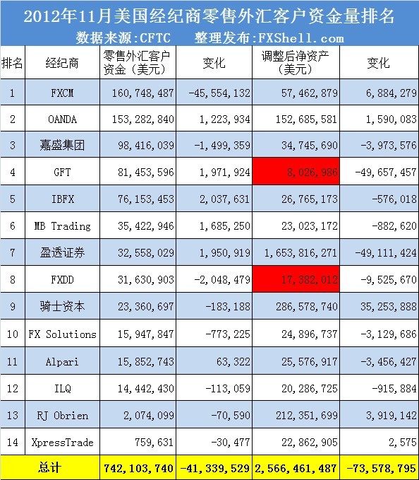 截止2012年11月30日美国零售外汇客户资金排名表: