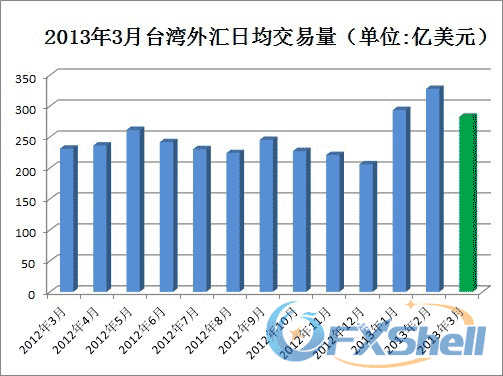 随着今年连续两个月外汇市场的交易量持续增长,3月份整体都出现了下滑情况。台湾也不例外,根据台湾“中央银行”统计的数据显示,2013年3月份台北外汇市场交易量为5933.1亿美元,日均交易量为282.5亿美元,同比增长18%,环比下降14%。