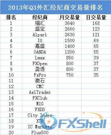 通过我们针对全球外汇经纪商的调查数据显示,今年第三季度,福汇以日均168亿美元的交易量继续蝉联为全球最大的外汇经纪商(不包含日本),其次是盛宝银行以123亿美元的日均交易量位列第二,第三是Alpari的121亿美元。